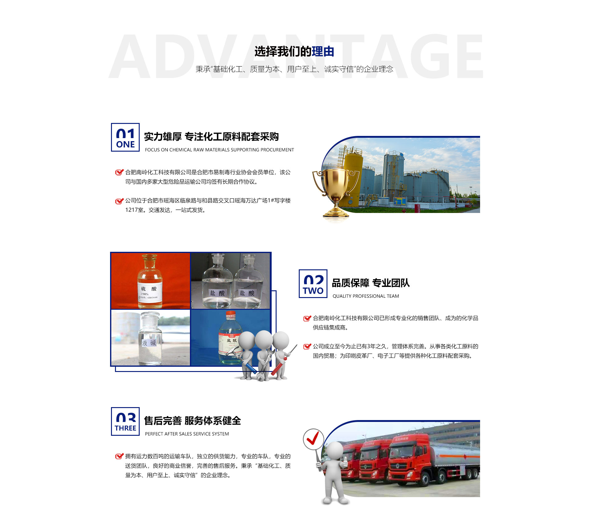 關(guān)于我們合肥南嶺化工科技有限公司是合肥市易制毒行業(yè)協(xié)會(huì)會(huì)員單位,該公司與國內(nèi)多家大型危險(xiǎn)品運(yùn)輸公司均簽有長期合作協(xié)議,擁有運(yùn)力數(shù)百噸的運(yùn)輸車隊(duì),獨(dú)立的供貨能力,良好的車隊(duì)運(yùn)輸,有效的送貨團(tuán)隊(duì),良好的商業(yè)信譽(yù),完善的售后服務(wù)。秉承“基礎(chǔ)化工、質(zhì)量為本、用戶至上、誠實(shí)守信”的企業(yè)理念。從事各類化工原料的國內(nèi)貿(mào)易;為各個(gè)化工廠、印刷皮革廠、電子工廠等提供各種化工原料配套采購。目前,公司正朝著以貿(mào)易為基礎(chǔ)、以實(shí)業(yè)為依托,采購、銷售,內(nèi)外貿(mào)一體化,上下游一體化,具有綜合增值能力和復(fù)合競爭能力化工原料供應(yīng)商。本公司主要經(jīng)營的產(chǎn)品有:鹽酸、硫酸、液堿、片堿等。合肥南嶺化工科技有限公司已形成服務(wù),售后一體化的團(tuán)隊(duì)、成為的化學(xué)品供應(yīng)鏈集成商。為客戶提供良好的服務(wù)及產(chǎn)品,本公司經(jīng)銷的各種產(chǎn)品不僅在安徽地區(qū)深受用戶好評(píng),而且具有很高的市場占有率,產(chǎn)品行銷各個(gè)地區(qū)。